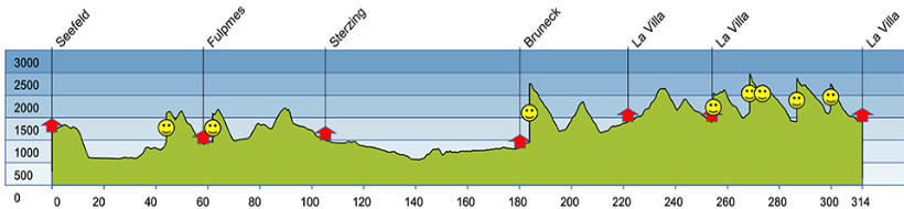 Die Biketour umfasste planmäßig etwa 314 km und 6.240 Höhenmeter (hm) bei der Streckenvariante