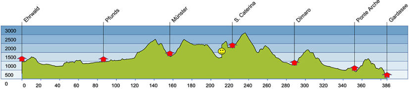 Strecke: ca. 390 km / Höhenmeter: 8.410 m / höchster Punkt: 2.662 m