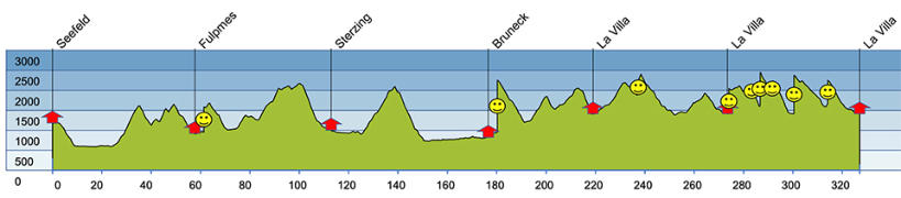 Die Biketour umfasste planmäßig etwa 314 km und 6.240 Höhenmeter (hm) bei der Streckenvariante